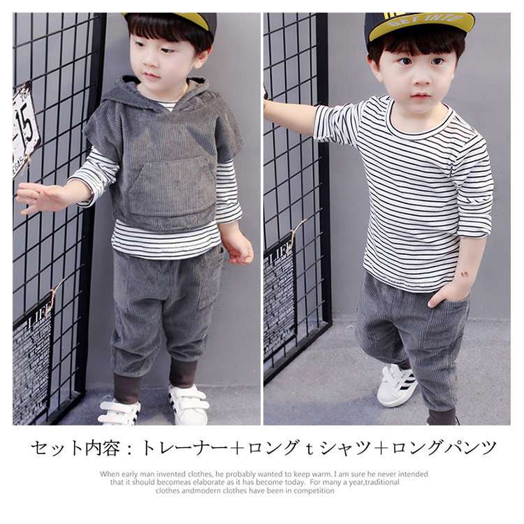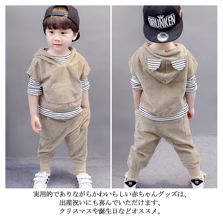 | セット内容:トレーナー+ロングtシャツ+ロングパンツ春秋の場合でアウターでもいい、冬はインナーとしてもいい、夏の場合で冷房で着る、一年中大活躍。セットで着ても、別々で着てもOKなので、お手持ちの服と合わせるとよりコーデの幅が広がります。実用的でありながらかわいらしい赤ちゃんグッズは、出産祝いにも喜んでいただけます、クリスマスや誕生日などオススメ。 | |