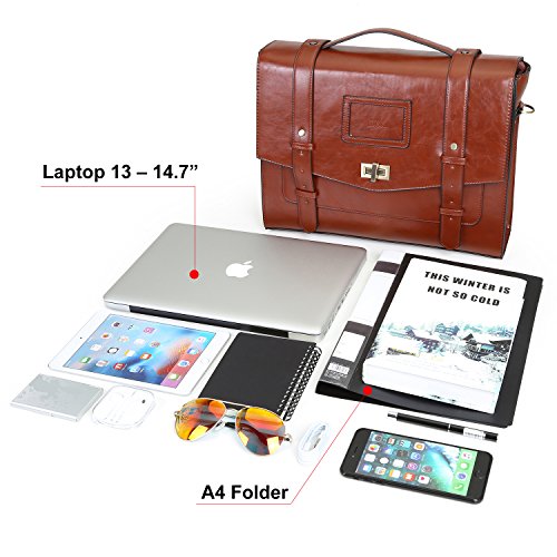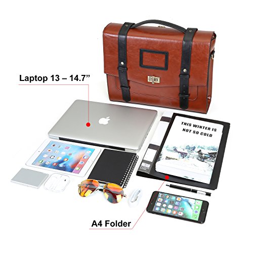 -. Feature : This messenger bag is made from soft faux (synthetic) leather, vintage bronze hardware and fully polyester lining / Product dimensions(HxWxH): 14.5" x 4" x 11.4"/ 37cm x 10cm x 29cm; Fit most of 14.7 laptop, Mac Book Pro, A+ paper and Ipad / Internal Structure: 1 large main compartment, 1 small zippered compartment, 2 small open compartments. This messenger bags is very durable and can hold all of your necessities for your everyday use. / Stylish Design: This bag has a stylish and classic looking. Vintage gold-tone metal hardware makes you be able to use this bag for many years to come. / Multifunctional: You can take it to many different occasions, like banquet, party, office, shopping, etc. Easy to match and suitable for any style of clothes.