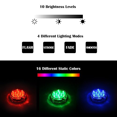 - Multi-purpose:This Underwater LED Light perfectly applies to the stage, Disco, shopping malls, jewelry stores, showrooms, showcase, cabinet, museums, shops, aquarium light fixture, fish Tank light ,family bulbs, Vase Base, Floral, Pond, Pool, Wedding, Halloween, Party, Christmas, Fountains and other occasions