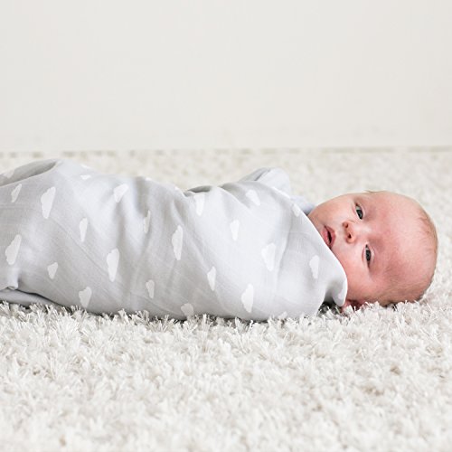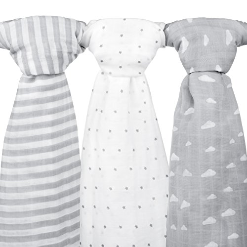 Muslin Baby Swaddle Blankets, 47x47 (3 Pack) Grey Cloud, Stripe & Stars
