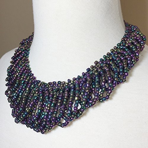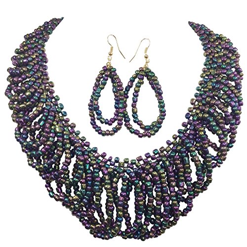 Multi Color Iridescent Beads Teardrop Loops Designer Look Statement Necklace & Earring Set (Purple & Blue & Green)