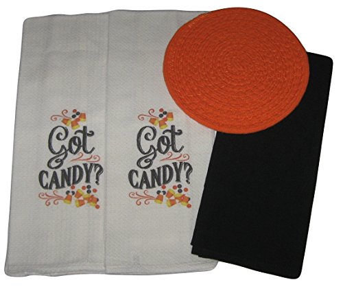 Got Candy Black Orange Dish Towels and Trivet Halloween Kitchen Set (4 Items)