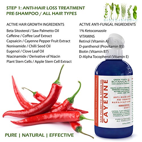 Step 1 should be used before shampooing. Shake well before use. Apply to areas of concern and leave in for at least 20 minutes. Shampoo out with our calp stimulating shampoo (Step 2) and follow with our Lavender restoration conditioner (Step 3). The best results are achieved when applied 2-3 times a week. While hair loss may begin to slow within a short period of time, visible results naturally will take at least 3 months to be seen. Make sure you are not allergic and avoid contact with eyes. Doctor recommended hair loss therapy. Our Cayenne Anti-Hair Loss Treatments are Herbalceutical Lab Formulated, Paraben-Free and were scientifically developed based on the physiology of human hair growth. Our natural hair products work to reduse hair loss by stimulating hair follicles to stay in the growth phase. Effective and natural hair products for Anti-DHT, Androgenetic Alopecia and Postpartum hair loss therapies. Best Womens Product 2017.