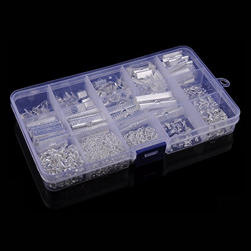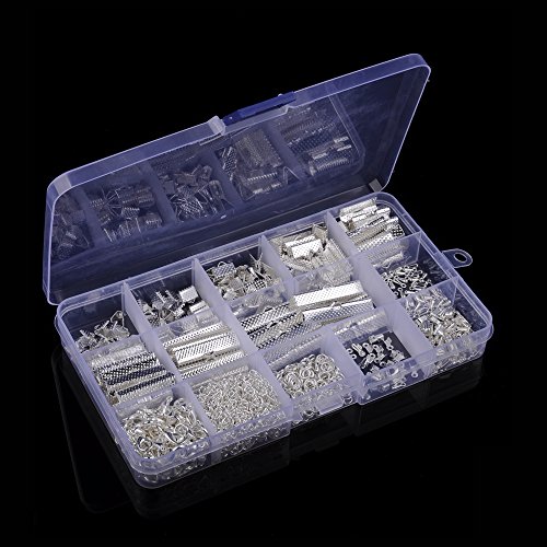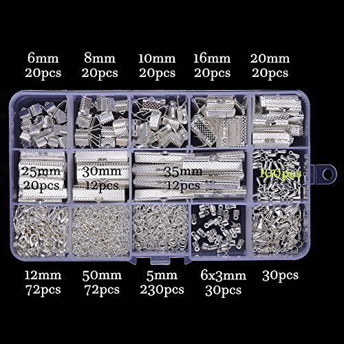 144 Pcs Ribbon Clamp 8mm 10mm 16mm 20mm 25mm 30mm 35mm and 72 Pcs Lobster clasps 12mm 230 Pcs jump rings 5mm 72pcs chain extension 100 Pcs Alloy Drop End for Jewelry findings (SILVER PLATED)
