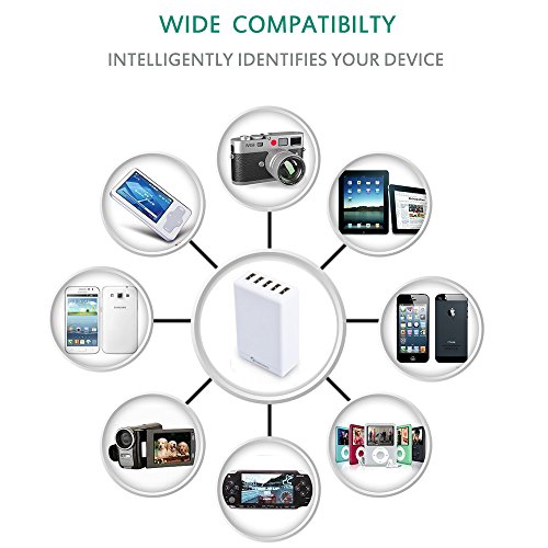 Highest Power, multiple protection, safe and high efficiency - World's highest output of 40 watts with 8 amps through five ports lets you charge any combination of phones, tablets or other USB-charged devices simultaneously. Fire-resistant and hardened plastic outer shell for durability, build-in premium circuitry and microchip ensure device safety.