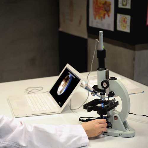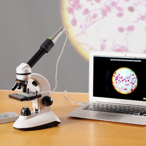 Attach your Point 2 View camera to the microscope eyepiece to share with the whole class