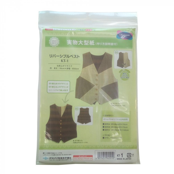 作り方説明書付き。リバーシブルに使えるベストの型紙です。※出来上がりサイズには、若干の差が生じます。 |