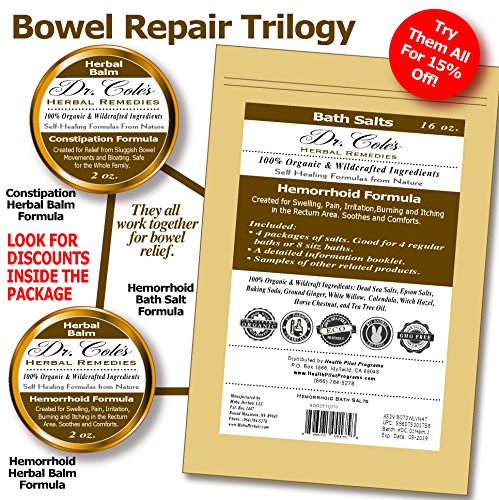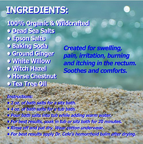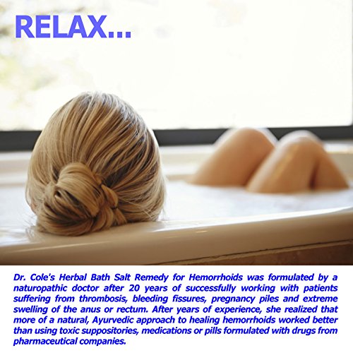 WHAT IT IS: Dr. Cole's Herbal Hemorrhoid Bath Salts, used in sitz baths, was created by a Naturopathic doctor after 20 years of successfully working with patients suffering from thrombosis, bleeding fissures, pregnancy piles & extreme swelling of the anus or rectum. After years of experience, she discovered that employing a natural, Ayurvedic approach towards healing hemorrhoids was more effective than using medications, suppositories or pharmaceutical products that are toxic to the human body.