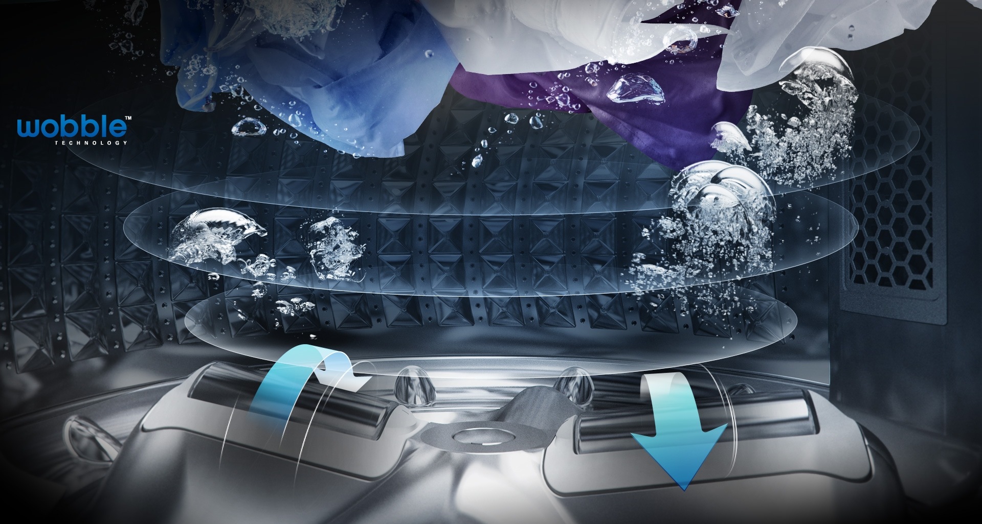 Wobble technology provides gentle care of fabrics without compromising washing performance. Wobble pulsators generate a dynamic, multi-directional washing flow that prevents tangles and increases washing power.