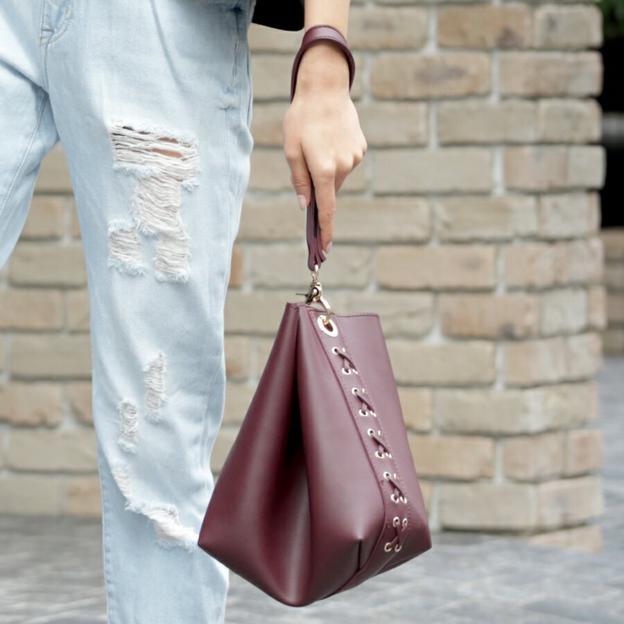 汚れにくく高級感漂うフェイクレザーを使用。両サイドに施したレースアップもポイントです。