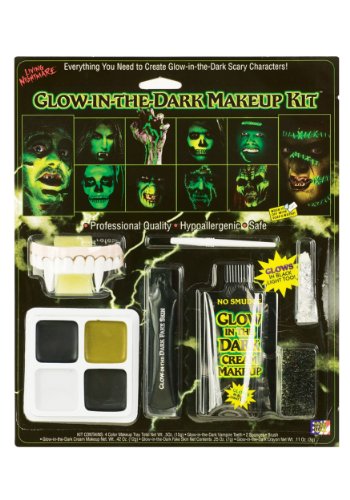 Make sure your family glows bright this dark Halloween night with this fun Glow In the Dark Family Make Up Kit! The kit includes makeup tray, an application brush, glow in the dark cream makeup (0.3 fl oz), fangs, glow in the dark fake skin, glow in the dark crayon (0.9 oz) and 2 application sponges. The makeup is safe and hypoallergenic, making it easy to wear without irritation. Step by step instructions are included to ensure you achieve a professional look. 1 Glow In the Dark Family Make Up Kit is included per package.
