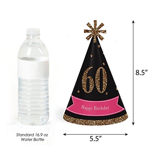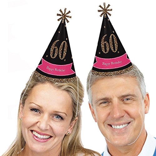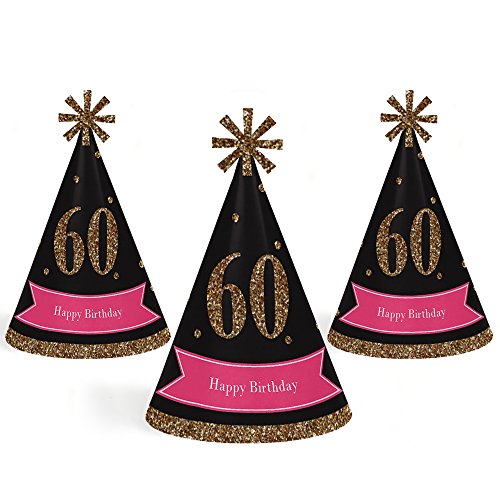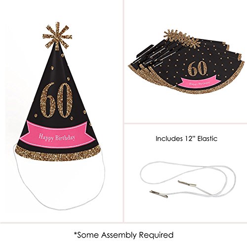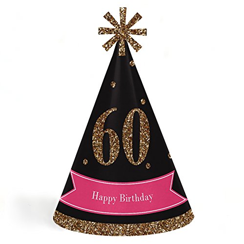 -. Title : Chic 60th Birthday - Pink, Black and Gold - Cone Happy Birthday Party Hats for Kids and Adults - Set of 8 (Standard Size)
