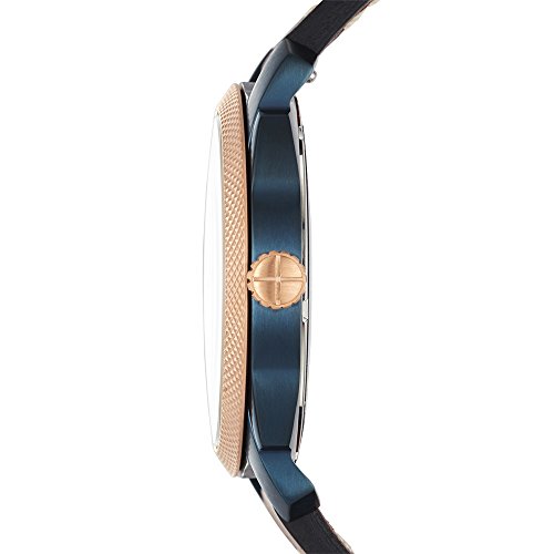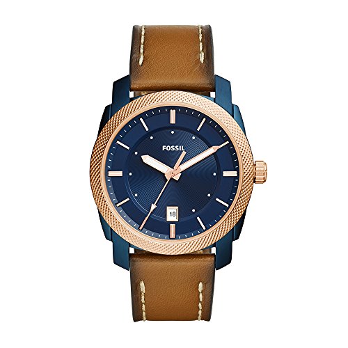 Watch Sizing Guide Keep your look hard-working with this ruggedly-handsome watch from Fossil®! Stainless steel case. Burnished leather strap with adjustable buckle closure. Round face. Three-hand analog display with quartz movement. Navy dial features rose gold-tone hands, date display window, minute track, and Fossil detailing. Water resistant 5 ATM. Display case included. Imported. Measurements: Case Height: 42 mm Case Width: 42 mm Case Depth: 9 4⁄5 mm Band Width: 11⁄13 in Band Circumference/Length: 9 in Weight: 2.5 oz This product may have a manufacturer's warranty. Please visit the manufacturer's website or contact us at warranty@support.zappos.com for full manufacturer warranty details.Feature