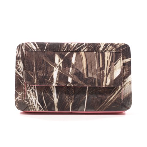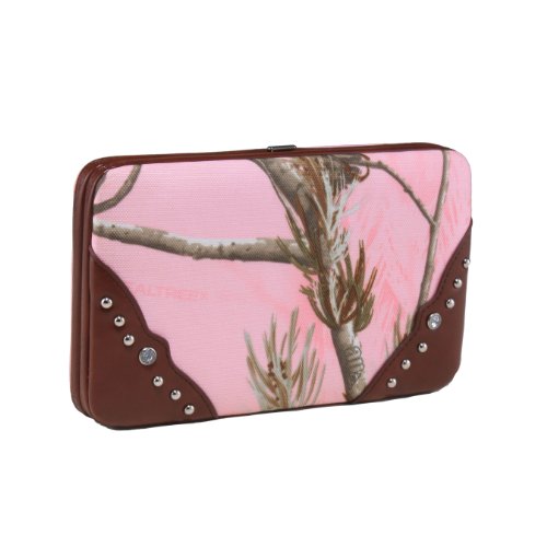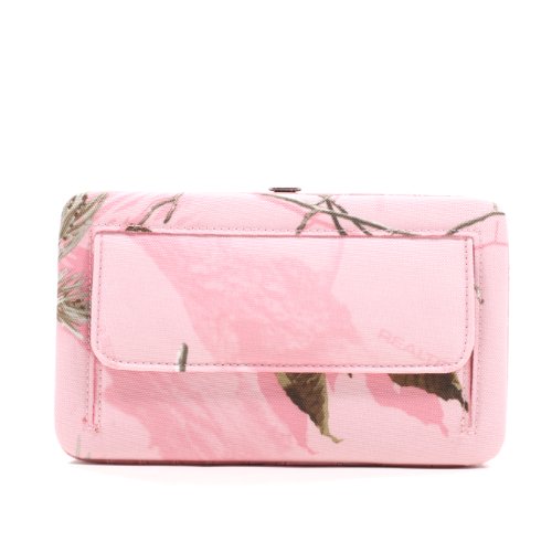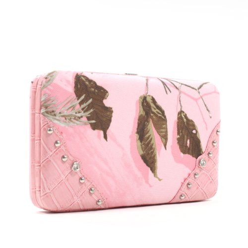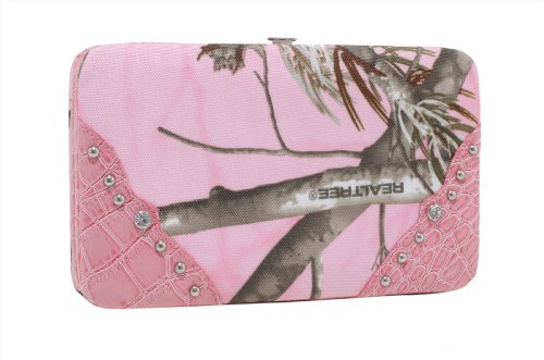 - Feature : Eye-catching Realtree camouflage clutch with secure push button closure / Trendy wallet measures a convenient 7.5" W x 4.5"H / Includes 2 interior ID windows, zipped closure coin pocket, check book sleeve, Pen holder, Bill pocket and 12 credit card sleeves / Complimentary faux leather accents with nickel and rhinestone embellishment / Extra back pocket with overlay flap and secure snap closure