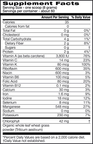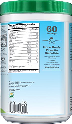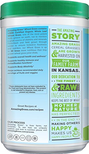 - Feature : Amazing Grass® Organic Wheat Grass offers 100% organic, whole-leaf wheat grass. / USDA Certified Organic, Non GMO Project Verified, Vegan, Gluten Free, Raw / Natural, organic flavor from whole-leaf grass harvested at its nutritional peak. / Mix one serving with 8 or more ounces of water, juice, or mixed into your favorite smoothie! / 60 servings, 17 ounces