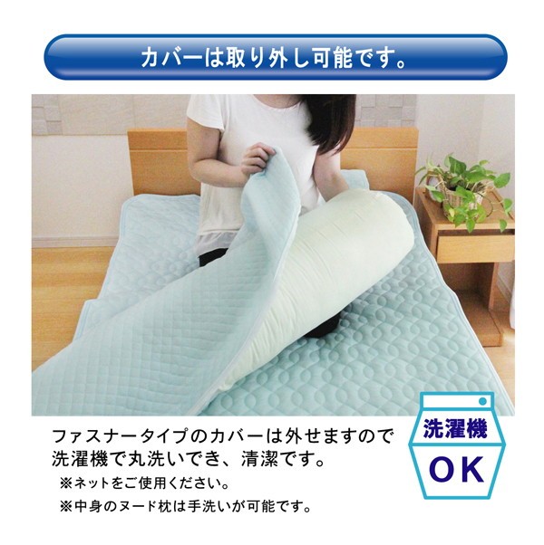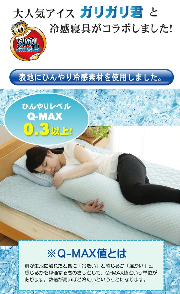 表地にはQ-MAX0.3以上の冷感素材を使用。ナイロンとレーヨンの冷たい繊維を使用することにより、ひんやりとした肌触りが特徴です。暑さで寝苦しい夜も快適に過ごすことが出来ます。洗濯機で丸洗いが可能なので、いつでも清潔にご使用頂けます。