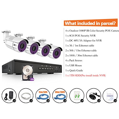 - 【Intelligent Email Alert System】Intelligent motion detection & email alert with crstal images; Never miss any suspicious moments with the smart motion-triggered alarm function. You can choose between whole screen motion detection and custom motion detection area. And when movements are detected in the masked areas, instant alarm will be sent by email. And this system come with 1TB hard drive. You can set it to record video directly, do not need buy the hard drive seperately.