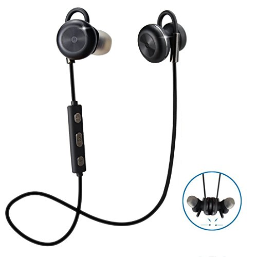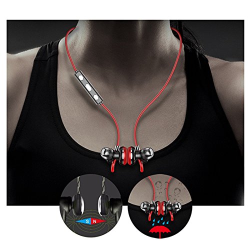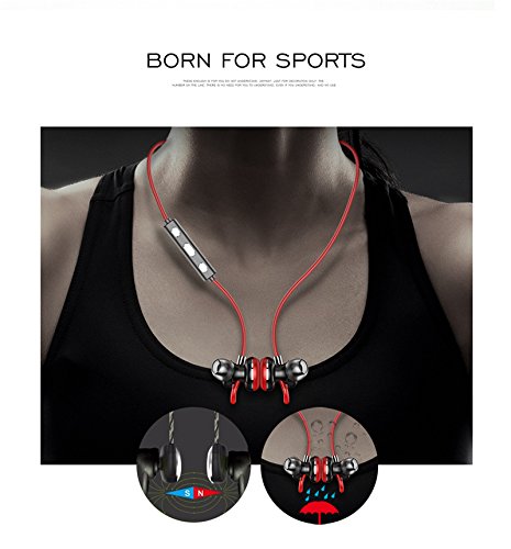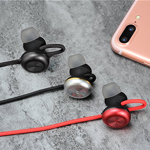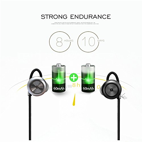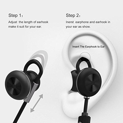 -. Feature : Comfortable Secure Fit Design: Headphones light weight 0.6oz. Ergonomic and flexible in-ear design, soft silicone angled earbuds and the over-ear hook guarantees a firm, secure fit to your ears, enables comfortable wearing without falling out. / Built-in Magnets Design: You can attach the two earphones together when they are not in use, and wear them like a necklace around your neck; a very convenient way to carry the earbuds when you aren't using them. / Sweatproof: Lightweight earbuds that play better, further, and in more Long battery life. Allows the headphones up to 5-hour playtime on a 2-hour charge. The Sweatproof design for gym, running, jogging, hiking, cycling and outdoor sports. / Significant Noise Reduction: Equipped with CVC 6.0 technology, the Bluetooth earbuds reduce background noise, enable clearer microphone sound. / Universal compatibility: It could compatible with ALL Bluetooth-Enabled Phone.
