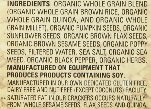 -. Feature : 5.5oz box of crackers / Certified organic, Gluten Free, non-GMO, Kosher, and Vegan / Crispy crackers made with organic whole grain brown rice, organic whole grain quinoa, organic pumpkin & sunflower seeds / Powder packed seeds with a fresh kick of flavor / Made in Gridley, California, in northern California's agricultural valley