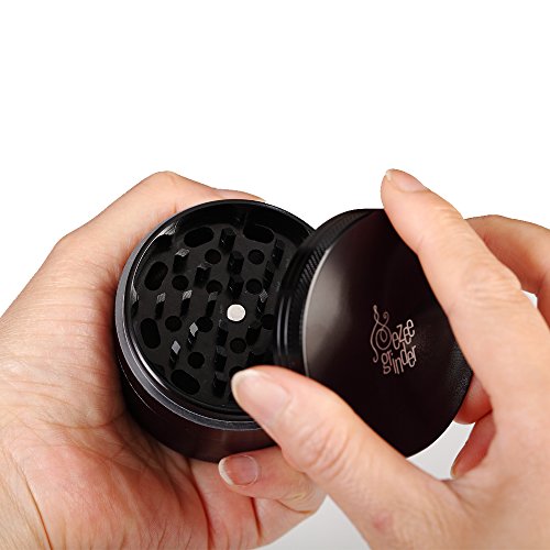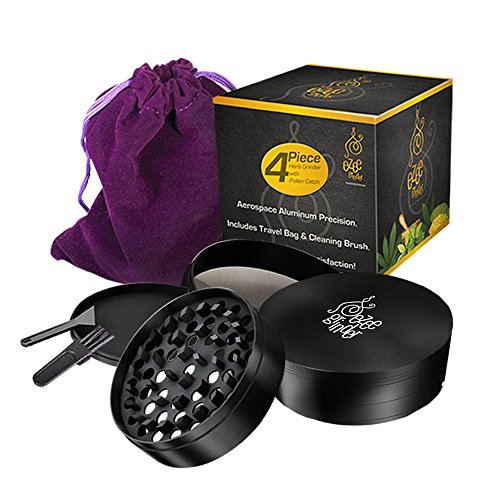 Herb & Weed Grinder with Pollen / Kief Catcher. 4 Piece Heavy Duty Anodized Aluminum. FREE Scraper, Brush, Travel Bag & Gift Box. 2.5 Inches Black. Designed to last!