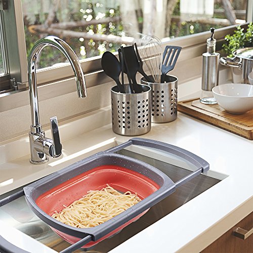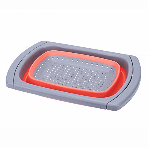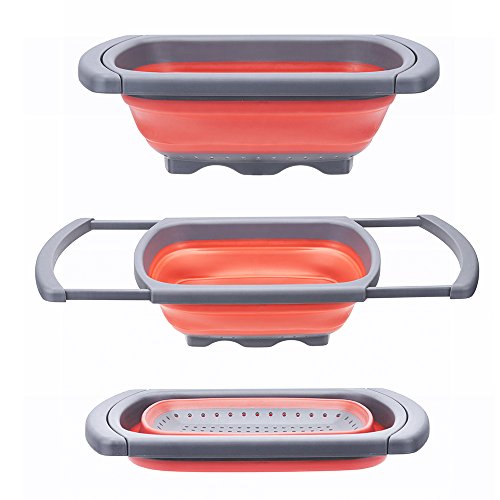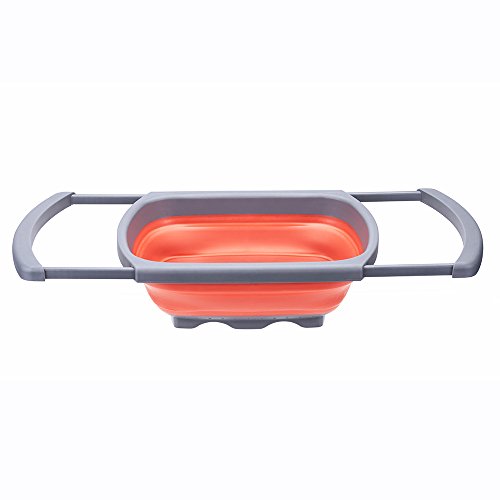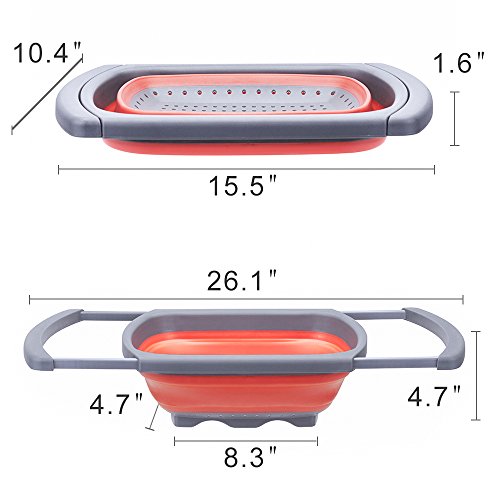MESS FREE STRAINING: With the collapsible colander you can easily strain your vegetables or pasta in a neat and reliable way. The Silicone collapsible colander has extendable handles that can extend up to 26.1" so it can perfectly fit any sink. When not extended, the drainer is 10.4"x15.5" and can even stand on its own for maximum security and convenience.