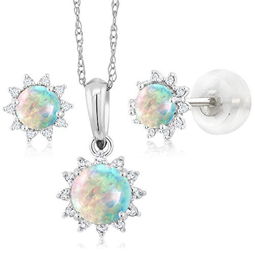 -. Title : 18K White Gold Cabochon White Simulated Opal and Diamond Pendant Earrings Set