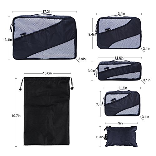 ✔ Set includes 1 large (17.3 x 13.4 x 3.9 inches), medium (13.4 x 9.4 x 3.1 inches), small (11.4 x 7.1 x 3.1 inches), and slim (14.6 x 5.5 x 3.1 inches) Mryumi packing cube, and 1 cosmetic bag (9 x 6.3 inches), sackpack (13.8 x 19.7 inches), and 1 gift laundry Bag (20 x 22.8 inches)