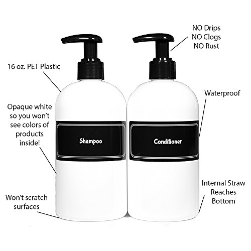Bottiful Home-16 oz. Refillable Empty Durable Opaque White PET Plastic Shampoo and Conditioner Pump Bottle Set-B&W Pre-Applied Fully Waterproof Labels-100% Rust-FREE, Clog-FREE, Drip-FREE