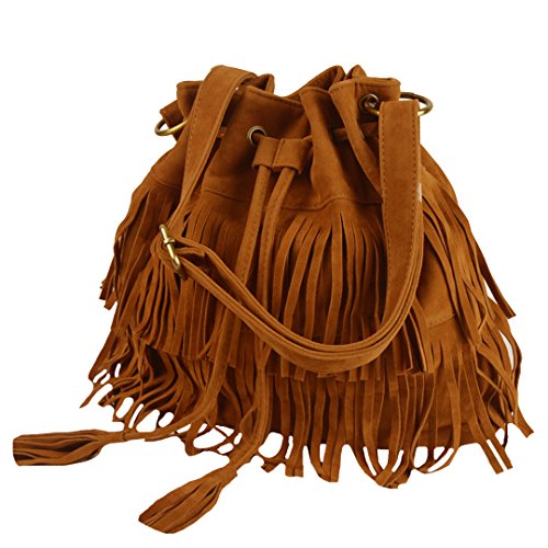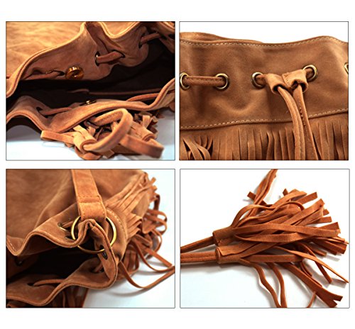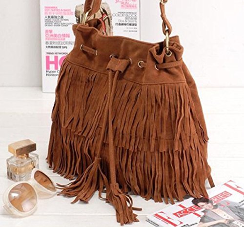 - Fashion and unique bag, cute tassel decorate, delicate workmanship, drawstring bucket shape design. Leisure style that is a very useful accessory brighten up your look, you will love this bag.