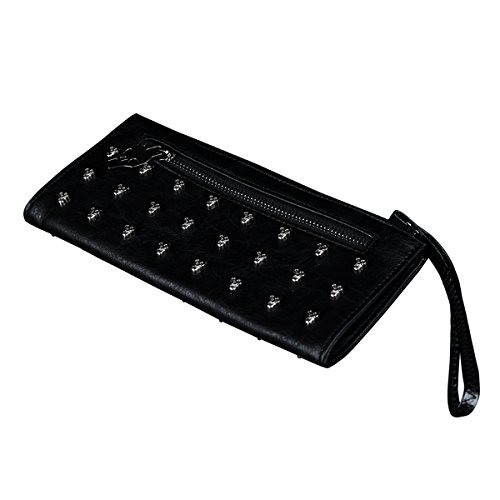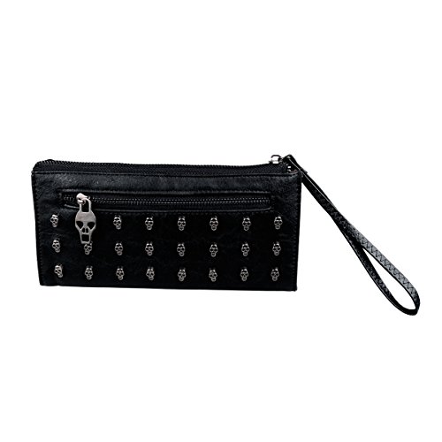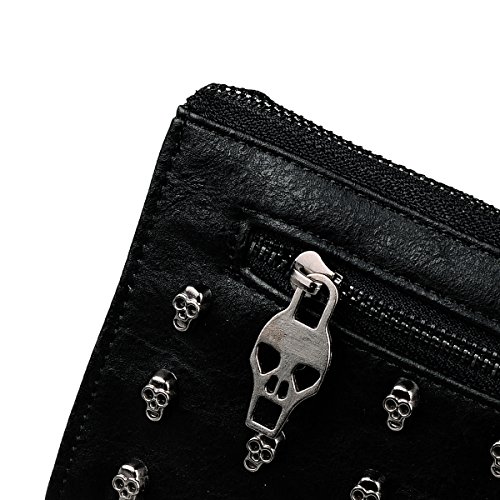 Smooth PU leather and lots of skull decoration add texture to this chic clutch bag. It features a secure snap closure that holds your valuable items inside. This clutch bag has enough space that offers storage for your cell phone, cash and credit cards, and one or two other small items. It comes with a gift box that you can buy for your friends as a wonderful gift.