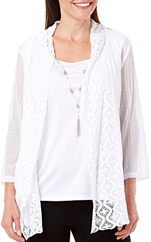 Studio : Alfred Dunner Publisher : Alfred Dunner Binding : Apparel Product Description Alfred Dunner offers style and comfort in this duet top, featuring a mixed lace and gauze overlay, an open front design, and a solid tank top underneath. Part of the White Now collection. Top length measures approximately 26 inches, measured from a size medium. Cotton. Polyester. 0