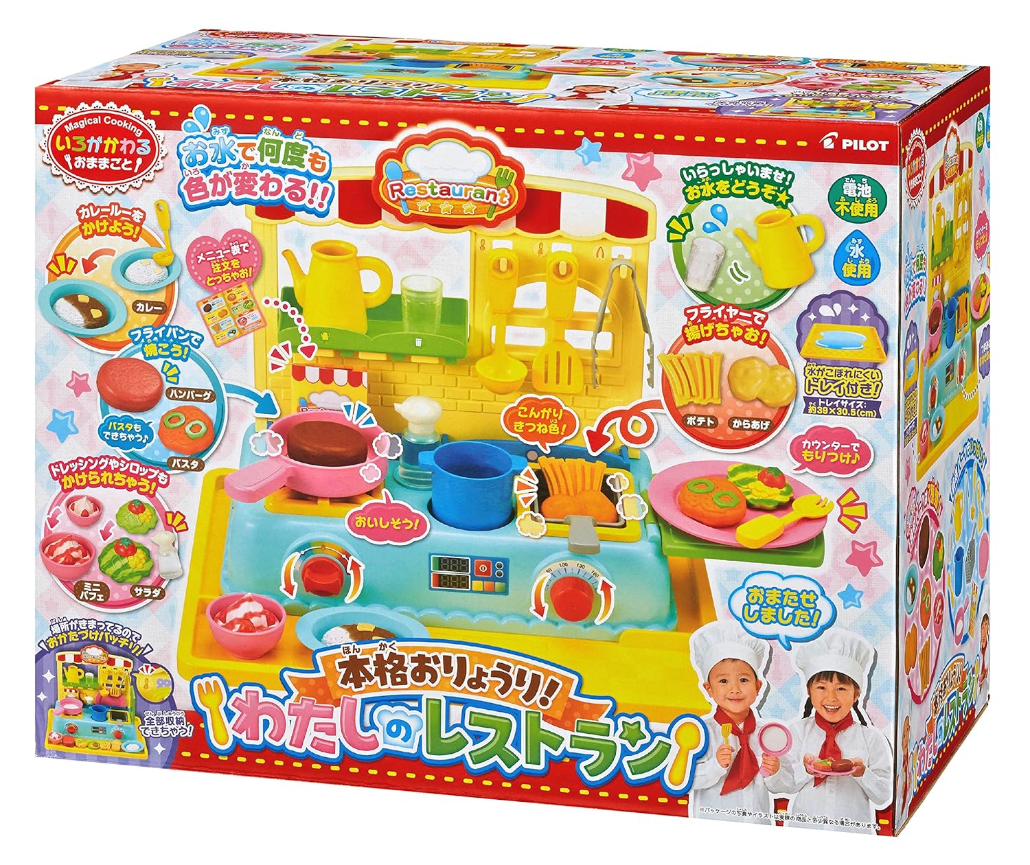 本格的な調理遊びができる不思議で楽しいレストラン! 水を使うと色が変わるのでリアルな調理体験ができます。焼く、揚げる、かけるなど様々なお料理遊びができます。ポットで飲み物遊びもできます。本体にすべて調理パーツ・食品などが収納できるので、お片付けも完璧。