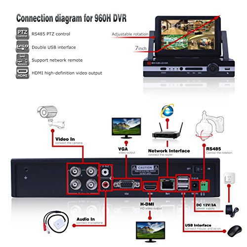 * If you desire to connect it to an external screen, there are both an HDMI port and VGA port available on the rear of this DVR unit. The screen itself can be flipped and tilted in almost every angle for optimal and comfortable viewing as well as being able to be folded away for protection and practical use.