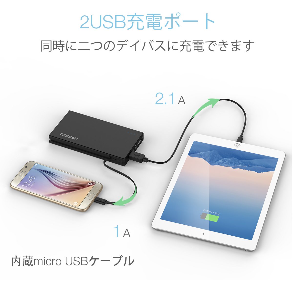 USB output: 5 V / 2.1 A (USB-A end), 5 V / 1A (micro USB cable)