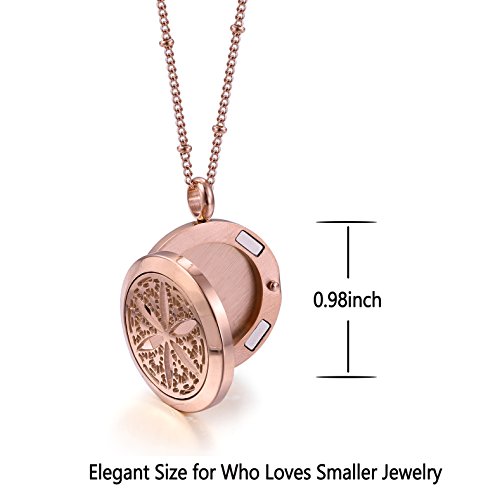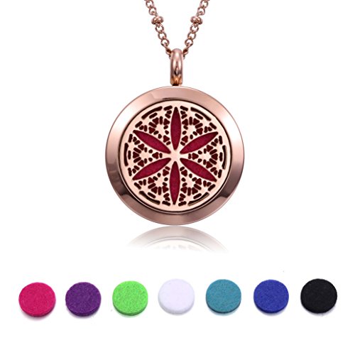 Rose Gold Aromatherapy Essential Oil Diffuser Necklace (Flower of Life), Hypoallergenic Stainless Steel Locket with 23" Chain 7 Refill Pad, Gift for Thanksgiving