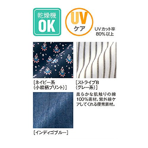 -. Feature : [カラー]: カーキ, インディゴブルー, チェックD(ピンク系), ストライプB(グレー系), ネイビー系(小紋柄プリント) / [サイズ]: S, M, L, LL, 3L / [バスト]: 97cm, 104cm, 111cm, 118cm, 125cm / [着丈]: 59cm, 60cm, 61cm, 62cm, 63cm / [肩幅]: 46cm, 48cm, 51cm, 54cm, 57cm / [袖丈]: 52cm, 52cm, 52cm, 52cm, 52cm