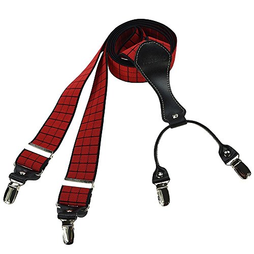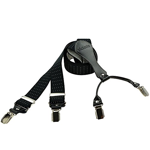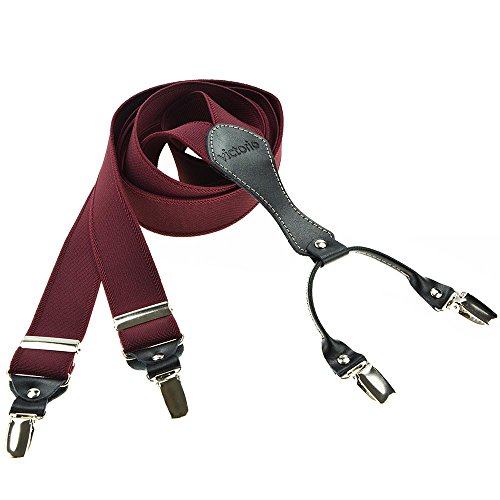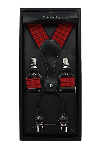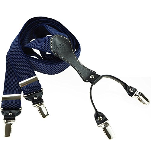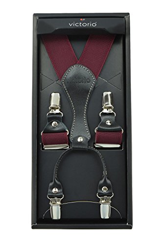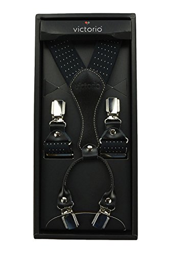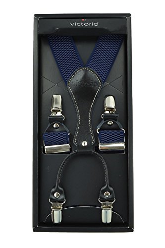 Binding : Apparel Product Description Elegant suspenders for trousers with subtle shine made of elastic strap, reinforced with leather details. Four metal clips. Regulated front, width - 3, 5cm. Universal size, max length 110cm (43 inch). Composition: 74% polyester, 26% elastodiene. Braces Come in elegant box - perfect for a gift.