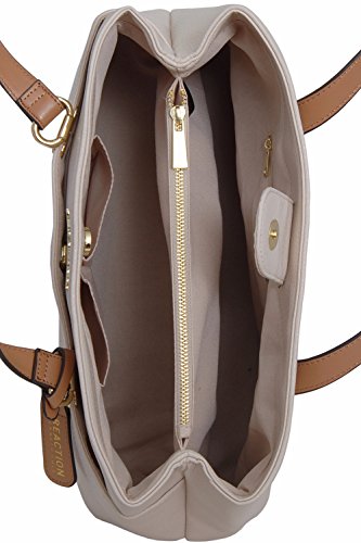 -. Feature : • Rich Pebble Faux Leather. Snap clip closure. Gold tone hardware. / • New Reaction Kenneth Cole Name Plate. Size 16" X 10" X 5.5".Strap Drop 10" / • 2 Open Compartments separated by one zipper middle section.. / • X-Large Snap Clip Closure Front Pocket / • 1 interior zipper pocket , 2 open pockets for extra storage.