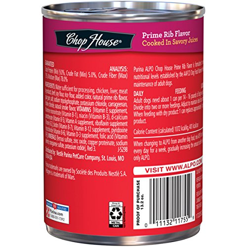 -. Feature : Twelve (12) 13.2 oz. Cans - Purina ALPO Chop House P.R.Ime Rib Flavor Adult Wet Dog Food / Made with real beef / Savory juices for added flavor / Contains high-quality protein sources / Delivers 100% complete and balanced nutrition for Adult Dogs