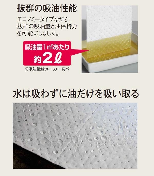 工場内の機械周りの漏油対策や床・通路などでの油による転倒防止にオススメの吸油性能抜群のシートです。エコノミータイプながら、抜群の吸油量と油保持力を可能にしました。水は吸わずに油だけを吸い取ります。 |