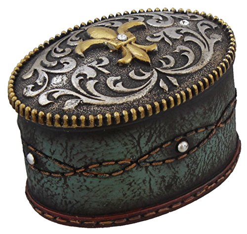Fleur De Lis Jeweled Belt Buckle Trinket Box - Turquoise Tooled Leather Look, Rhinestones - Silver Gold