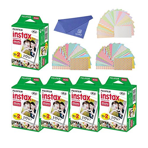 Fuji Instax Mini Instant Film 5-Pack (2x10 Shoots - Total 100) with Cleaning Cloth and 60 Piece Sticker for Fuji Mini 90,8,70,7s,50s,25,300 Camera SP-1 Printer