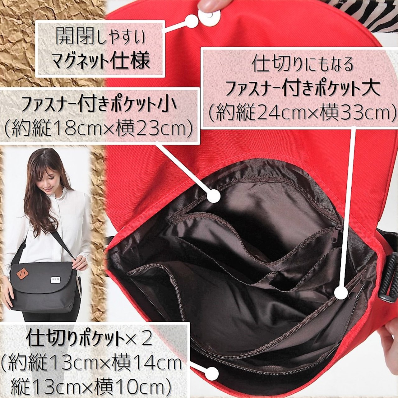 Outer storage: zipper pocket × 1 Inside storage: zipper pocket large (vertical 24 cm × side 33 cm) × 1 small zipper pocket small (vertical 18 cm × side 23 cm) × 1 divider pocket × 2 (length 13 cm × width 14 cm, length 13 cm