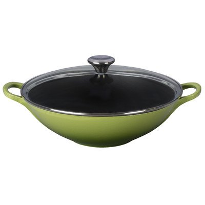 A staple of east Asian cuisine for centuries, woks are perfect for not only stir-frying, but also braising, steaming and stewing. This beautiful wok pairs the traditional curved sides with a flat base that ensures solid contact with any stovetop heat source. A tempered-glass lid locks in moisture while steaming and makes it easy to keep an eye on cooking foods. Constructed from le Creuset's legendary enameled cast iron, this wok is as beautiful to look at as it is to cook with.Feature