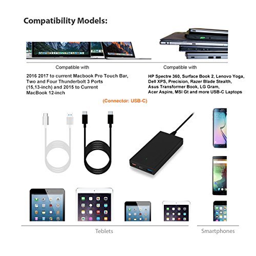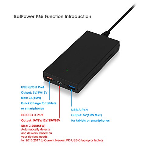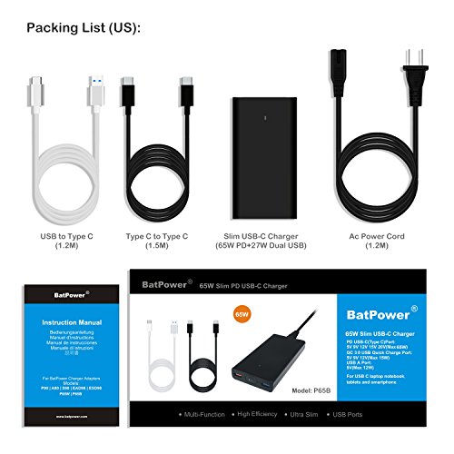 -. Feature : The BatPower P65 PD USB-C technology automatically detects and delivers 5V, 9V, 12V, 15V, 20V(Max65W), based on your devices needs. / Tested Charging for 2016 2017 Newest Macbook Pro 13 15 Touch Bar or Macbook 12 and more USB-C Laptops or tablets. Replace for 61W A1718 A1540 MNF72LL/A and Macbook MJ262LL/A Charger Adapter.(Note: Please use Genuine Type C Cable); Dual USB ports output 5V 25W for Apple Android tablet or smartphone, support 5V USB C devices. / P65 Charger size: 3.8 inches (L) x 2.3 inches (W) x 0.6 inches (H) Weight: 6 ounces. / Packing list: BatPower P65 Slim Charger, Type C Charging cable, AC Power Cord, Instructions Manual. / Warranty: 30 days money back or exchange, free 18 months warranty. (Note: Sold by BatPower only).