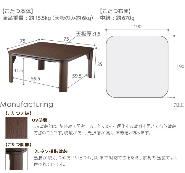 天板サイズ:幅75x奥行75cm・厚み15mm