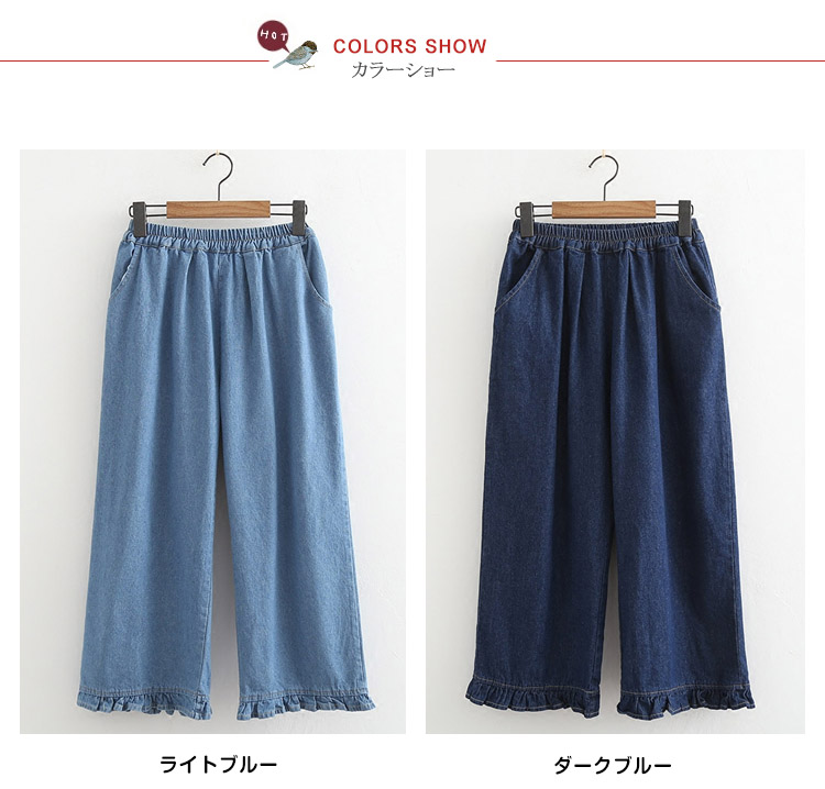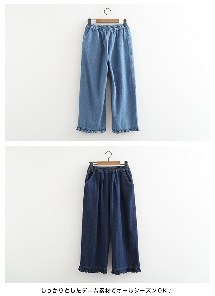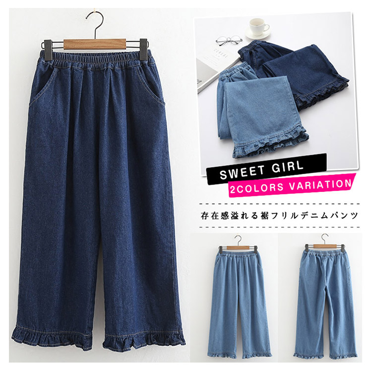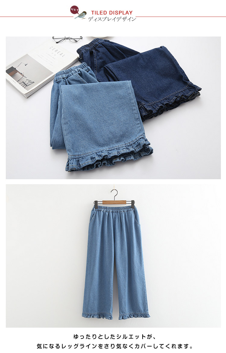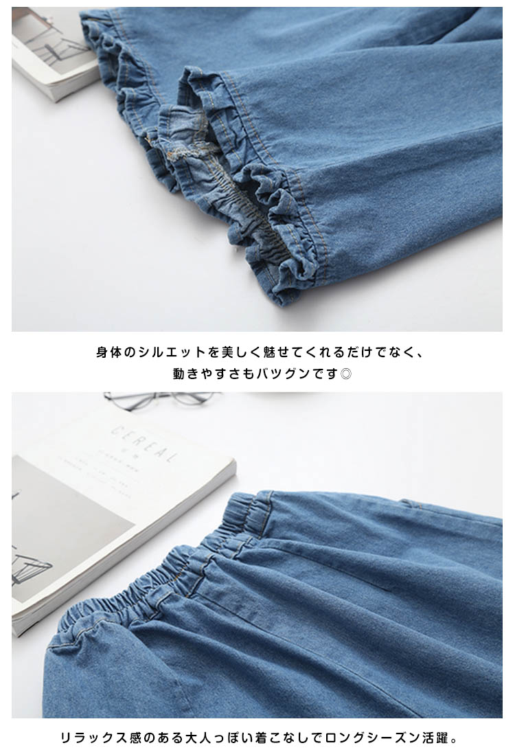 | 存在感溢れる裾フリルデニムパンツ。ゆったりとしたシルエットが、気になるレッグラインをさり気なくカバーしてくれます。しっかりとしたデニム素材でオールシーズンOK♪コートやジャケットはもちろん、春ニットやカーデなどとコーディネートすればカジュアルStyleを気軽に楽しむことができます。 | |