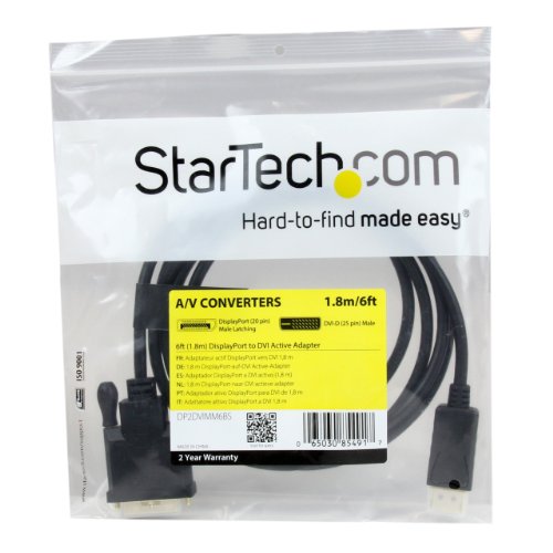 The DP2DVIMM6BS 6ft active DisplayPort to DVI converter cable lets you connect your DisplayPort-equipped desktop or laptop directly to a DVI monitor or projector with no additional adapters or cables required -- a cost-effective solution for enabling your new DisplayPort computer to work with an older VGA monitor or projector. For guaranteed compatibility with virtually any DisplayPort output the active DisplayPort to DVI adapter supports multimode (DP ) as well as single-mode DisplayPort signals. Unlike passive adapters, this ensures the DP2DVIMM6BS can be used with graphics cards that are not capable of outputting multimode DP signals, such as ATI Eyefinity cards. Plus, because the converter cable supports video resolutions up to 1920x1200 you can convert a DisplayPort video source to DVI without sacrificing video quality. The DP2DVIMM6BS is backed by a 2-year StarTech.com warranty and free lifetime technical support. 0 |