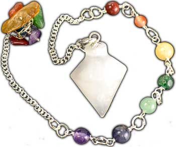 A lovely chakra pendulum with a bob made from selenite. Beads representing the 7 chakras (colors vary) run up the chain. 6" x 3/4"