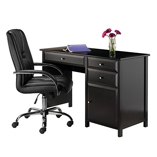 -. Binding : Kitchen -. Brand : Winsome Wood -. Color : Black -. EAN : 0021713222336 -. Feature : Overall desk size is 30.7"H x 47.2"W x 20.2"D. Leg clearance is 26.2"W x 25.2"H / Desk is made of solid and composite wood. Black faux leather chair. \ / Chair's seat height at lowest position is 19.6" and at the highest is 23.3" -. Label : Winsome Trading -. Manufacturer : Winsome Trading -. Model : 22233 -. MPN : 22233 -. NumberOfItems : 1 -. PackageQuantity : 1 -. PartNumber : 22233 -. ProductGroup : Furniture -. ProductTypeName : HOME_FURNITURE_AND_DECOR -. Publisher : Winsome Trading -. Studio : Winsome Trading -. Title : Winsome Wood Delta 2 Piece Set Office Desk with High Back Chair -. UPC : 021713222336